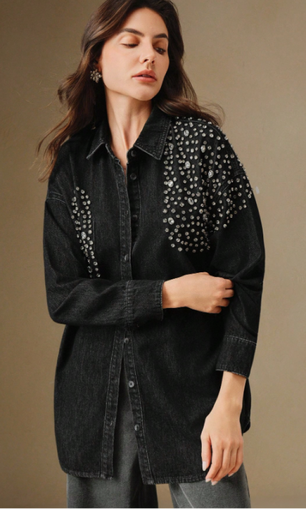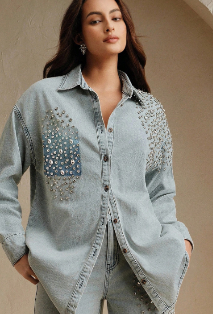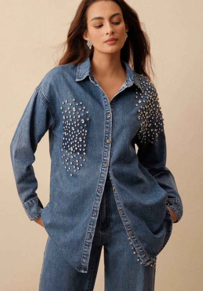 - بلوزة جينز تطريز الراين ستون والخرز الملون يعطي لمعة أنثوية تخليك ملفتة بكل مكان.
