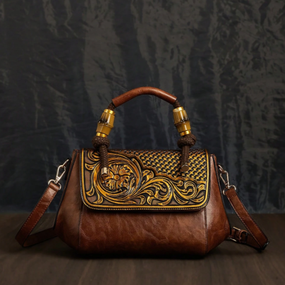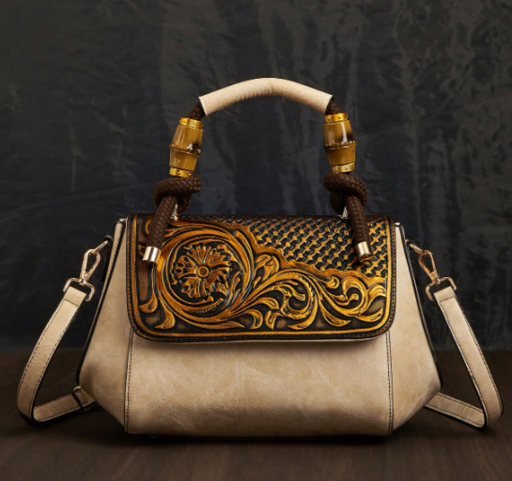 - حقيبة عتيقة مزخرفة نقوشها الذهبية الفخمة تعطيك إحساس إنك شايلة قطعة فنية مو مجرد شنطة.